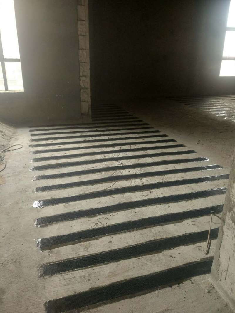 (6)粘贴碳纤维布,配置结构胶,然后用滚筒刷均匀涂抹于所粘贴部位,在搭接,拐角部位应当多涂一些,用特制带有纹路滚筒在碳纤维布表面沿同一方向反复滚压至胶渗出碳纤维布表面,以去除气泡,使碳纤维布充分浸润胶料,多层粘贴应重复以上步骤,待碳纤维布表面指触干燥为宜,方可进行下一层碳纤维布的粘贴,在最外一层碳纤维布表面均匀涂抹一层结构胶料,碳纤维如有搭接,搭接长度不应小于100mm。