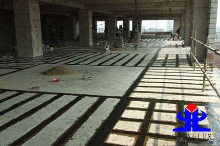 (2)基层处理,剔除混凝土表面出现劣化现象(如剥落,蜂窝,腐蚀等)的部位,对于较大部分的劣质层,在剔除后应用高标号水泥砂浆进行修复,对于裂缝布为,应先进行封闭后处理,用金刚石角磨机,砂轮或砂纸等工具,去除混凝土表面的浮浆,油污等杂质,结构表面的混凝土要打磨平整,转角粘贴处要进行倒角处理,并打磨成圆弧状(R=20mm)用吹风机将混凝土表面清理干净,并用丙酮擦拭表面。